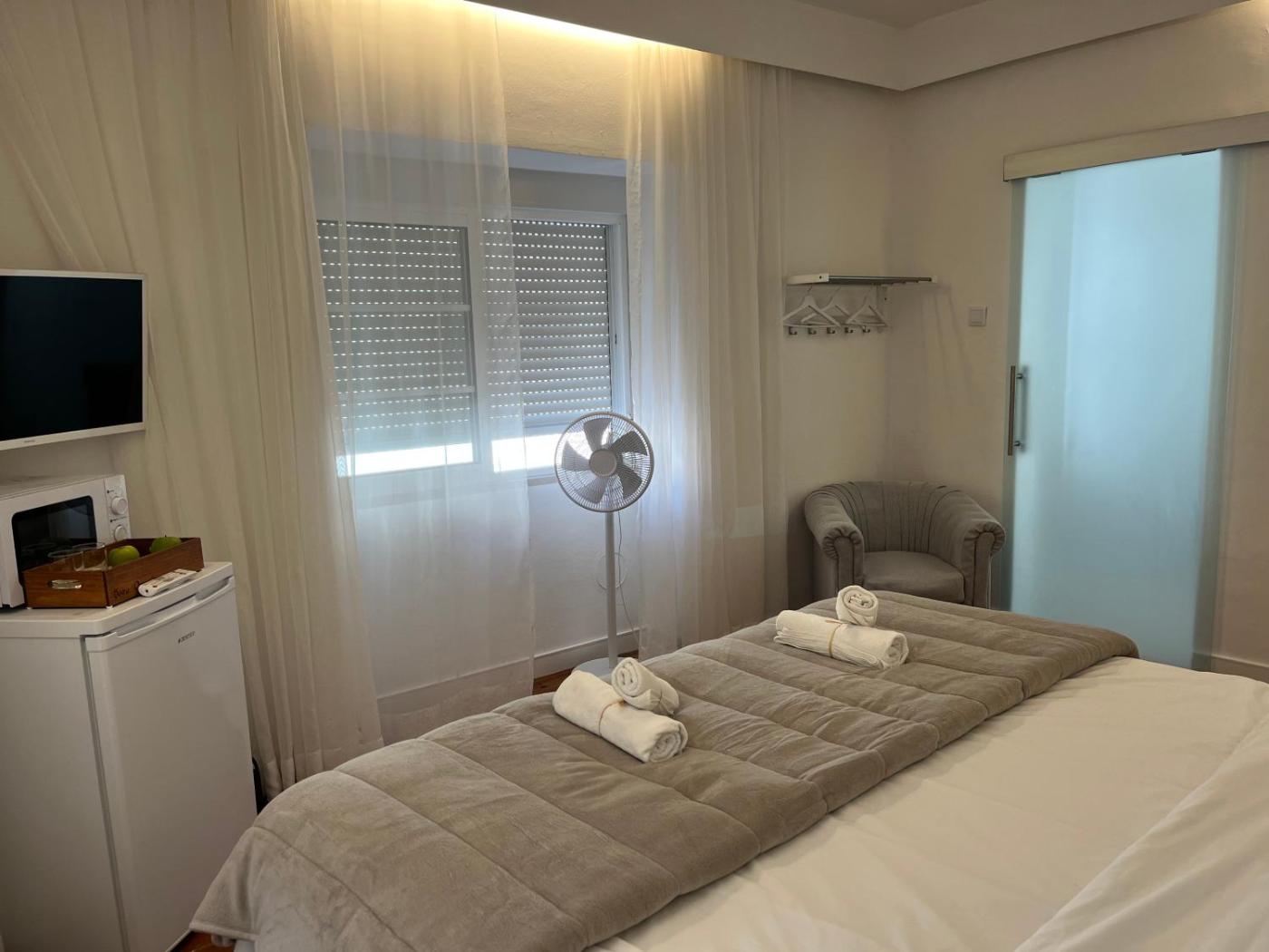 Quarto Duplo com Casa de Banho Partilhada. This room with simple décor features a king size bed for 2 persons with a flat-screen TV, mini bar ,microwave, fruit tray with 2 glasses, bottled water. Guests have access to a shared bathroom with walk-in shower , shampoo, body wash, hand wash soup and air-dryer. Linen and towels are provided. Free WiFi is available. ;