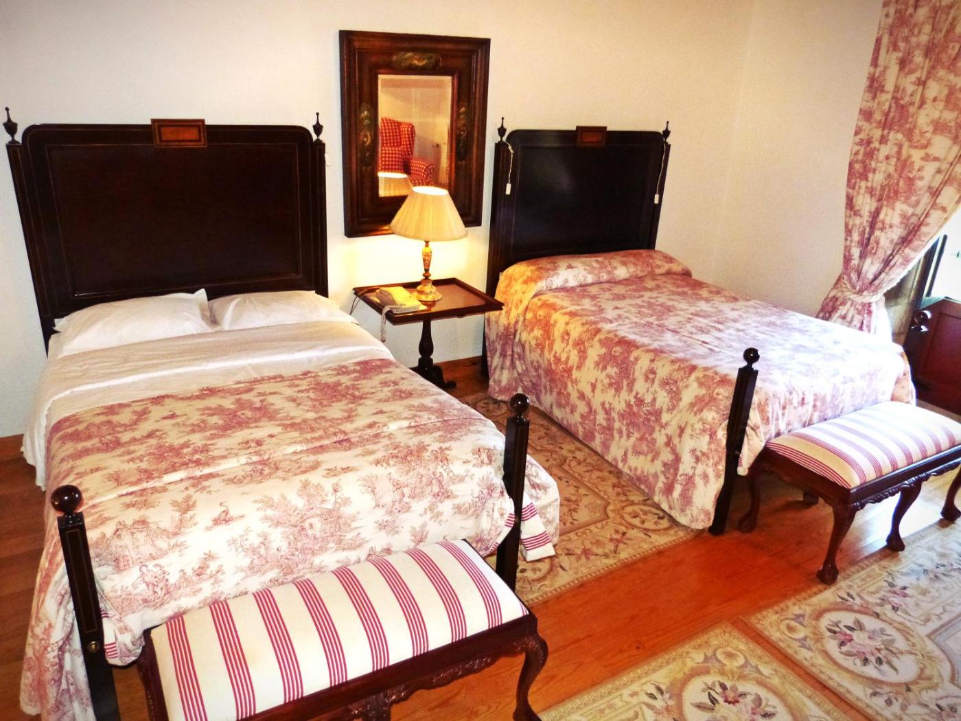 Quarto Duplo. Este quarto está decorado com mobiliário antigo e tem 2 camas de casal. Inclui uma televisão e um sofá. A casa de banho dispõe de 2 lavatórios. Também inclui um roupão de banho, chinelos e produtos de higiene pessoal. ;