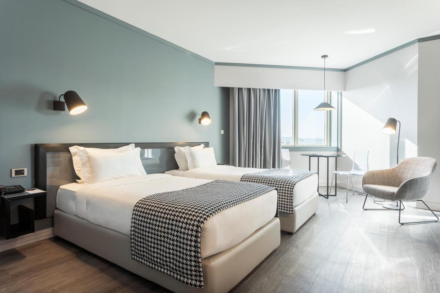 Quarto Twin Conforto. Este quarto com 2 camas individuais está alojado entre o 1.º e o 9.º piso e apresenta uma decoração elegante e uma televisão LCD com canais por cabo. ;